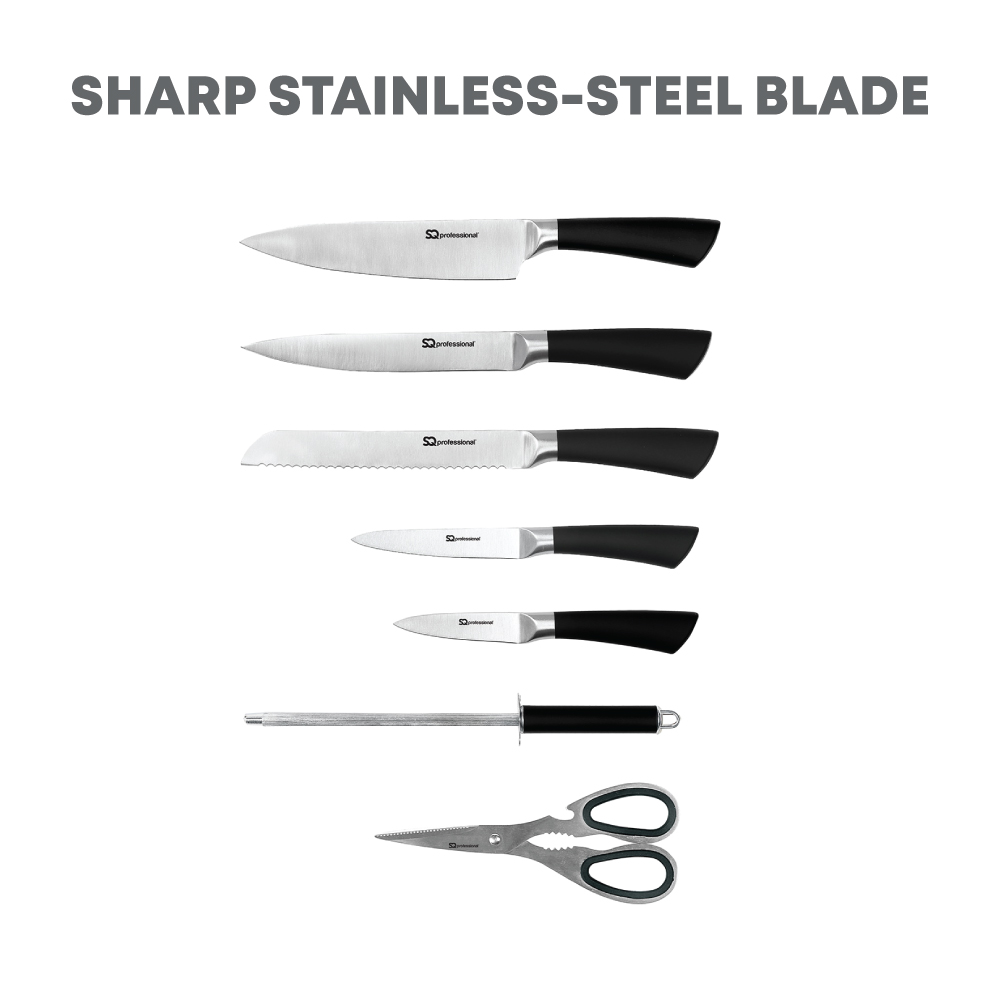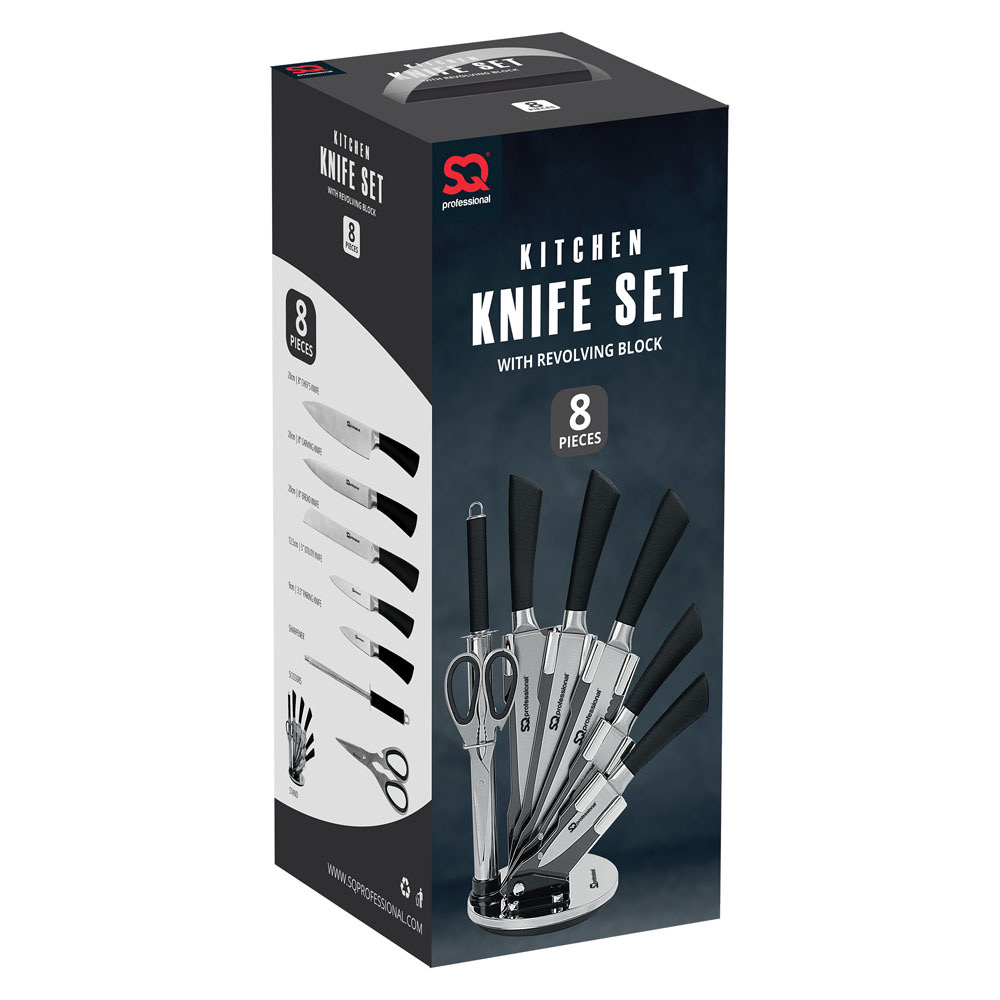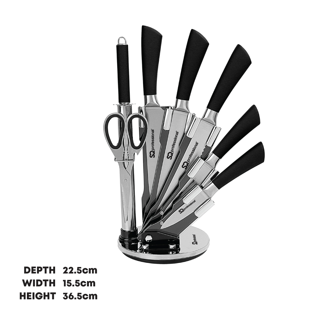 The SQ Professional 8pc Stainless Steel Kitchen Knife Set comprises 5 professional knives, kitchen scissors and a sharpening steel, catering to your daily kitchen tasks of chopping, slicing, dicing and mincing various meats, vegetables, fruits and bread. This knife set is not only practical but also sharp and precise, making it an essential tool for cutting tasks. The knives can be neatly organised on a space‐saving knife holder, ensuring easy access and separation from other items due to the transparent window. The rotatable knife holder not only offers functionality but also adds an attractive element to the kitchen, making it a great addition.