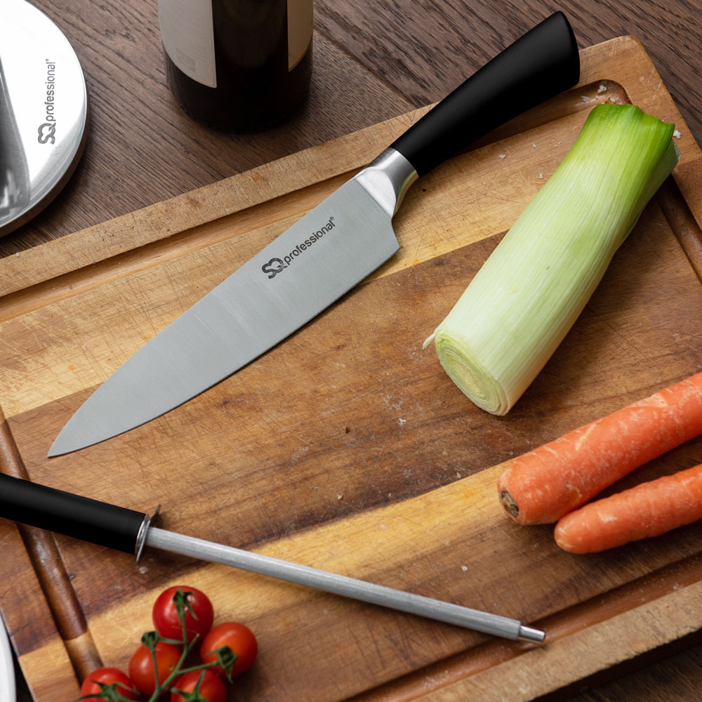 Includes 5 knives, 1 pair of scissors and a sharpening steel