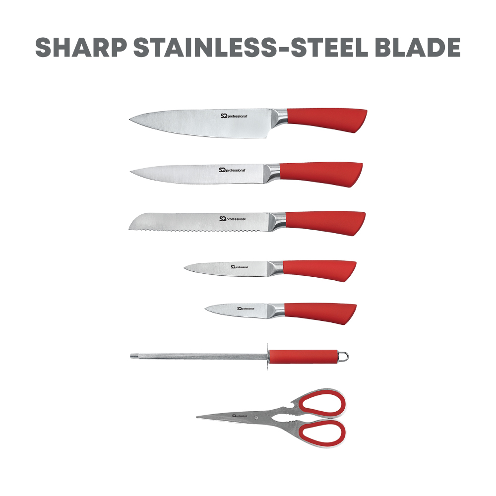 Includes 5 knives, 1 pair of scissors and a sharpening steel