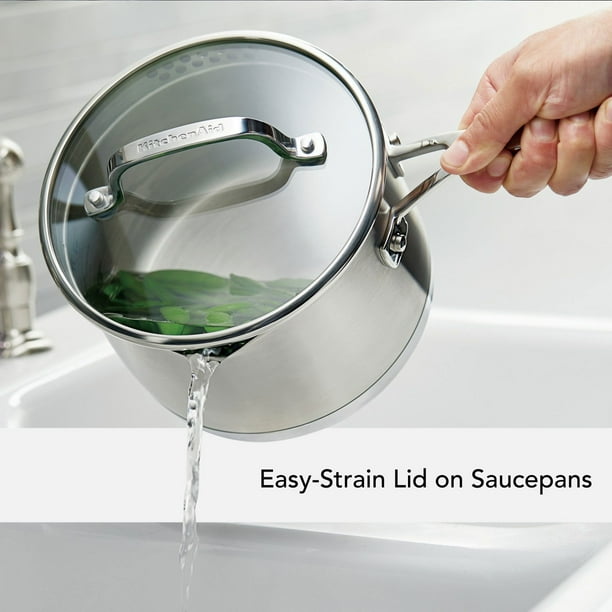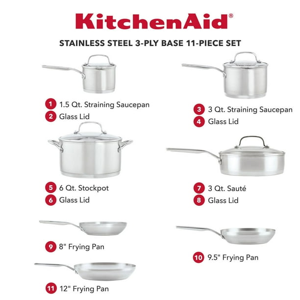 Elevate your culinary experience with the KitchenAid 3-ply base stainless steel cookware. Designed with an extra-thick layer of heat-conducting aluminum, this cookware ensures even heat distribution from edge to edge, eliminating hot spots for consistent cooking results. Perfect for both novice and seasoned cooks, this set offers reliable performance for a variety of recipes.