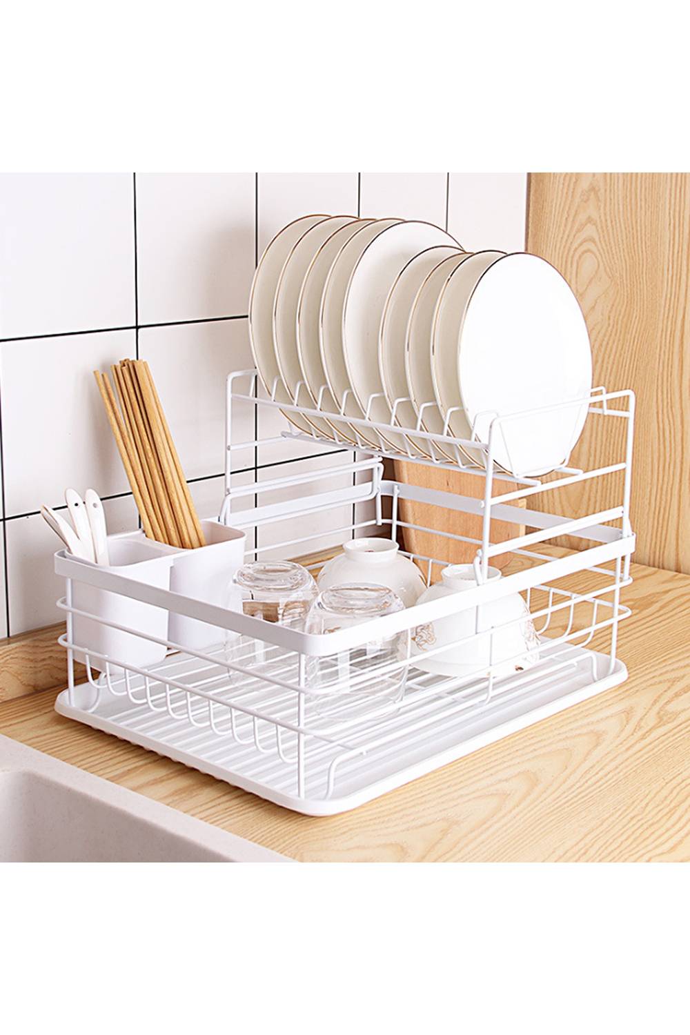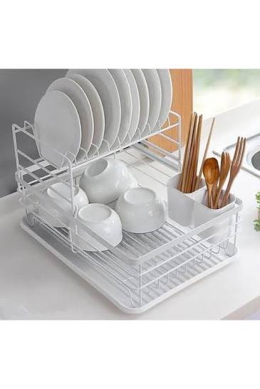 With 2 Tier design, this dish drainer rack with drip tray provides large space for storing your various tableware like plates, dishes and glasses. Attached with 2 plastic containers for holding spoon, fork, knife and chopsticks. The dish rack can be detachable to use separately or together according to your needs. / The dish drying rack feature a removable plastic drip tray convenient for handling the water in time to keep a dry dishing rack, ensure a clean kitchen space. / The dish rack is made of high-quality metal with black coating on the surface, preventing the dishes from scratching for durability. The sturdy construction will provide a strong load-bearing to hold your kitchen suppliance stably. / The dish drainer rack with drip tray is easy to assemble with clear instructions, just need a few minutes to install this kitchen dish drainer rack!