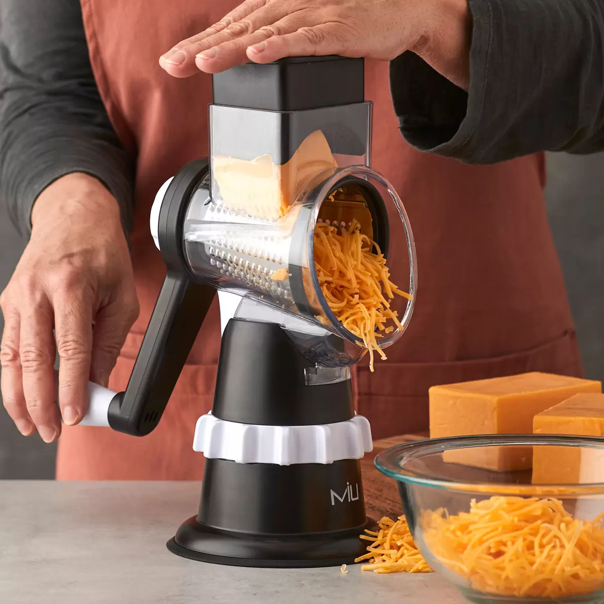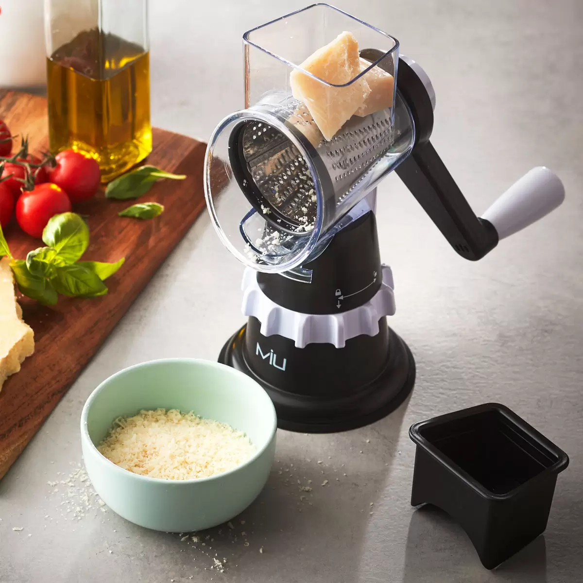 The MIU Drum Rotary Grater comes with 4 attachments that includes medium and coarse drums, which can grate cheeses like cheddar, mozzarella, parmesan and a variety of moderately firm cheeses; a fine drum which can grind peanuts and almonds. The slicing drum, that can slice radishes, carrots, cucumbers and chocolate and the crinkle drums which are great for crinkle fries. The MIU Grater is great for food preparation and makes slicing, shredding and grinding far more efficient and safer.