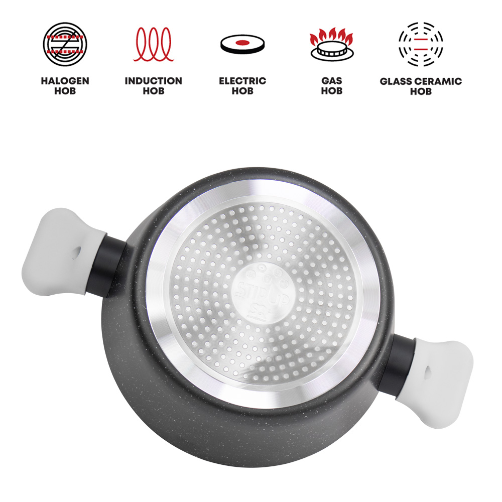 The StirUp cookware set is designed to cover everyday cooking essentials without taking up unnecessary space. This three-piece set includes a 16cm saucepan, a 24cm stockpot, and a 24cm frying pan, making it well suited to couples, students, and smaller kitchens. A shared lid design allows the stockpot lid to be used on the frying pan, helping reduce storage demands while keeping the set practical and easy to organise.