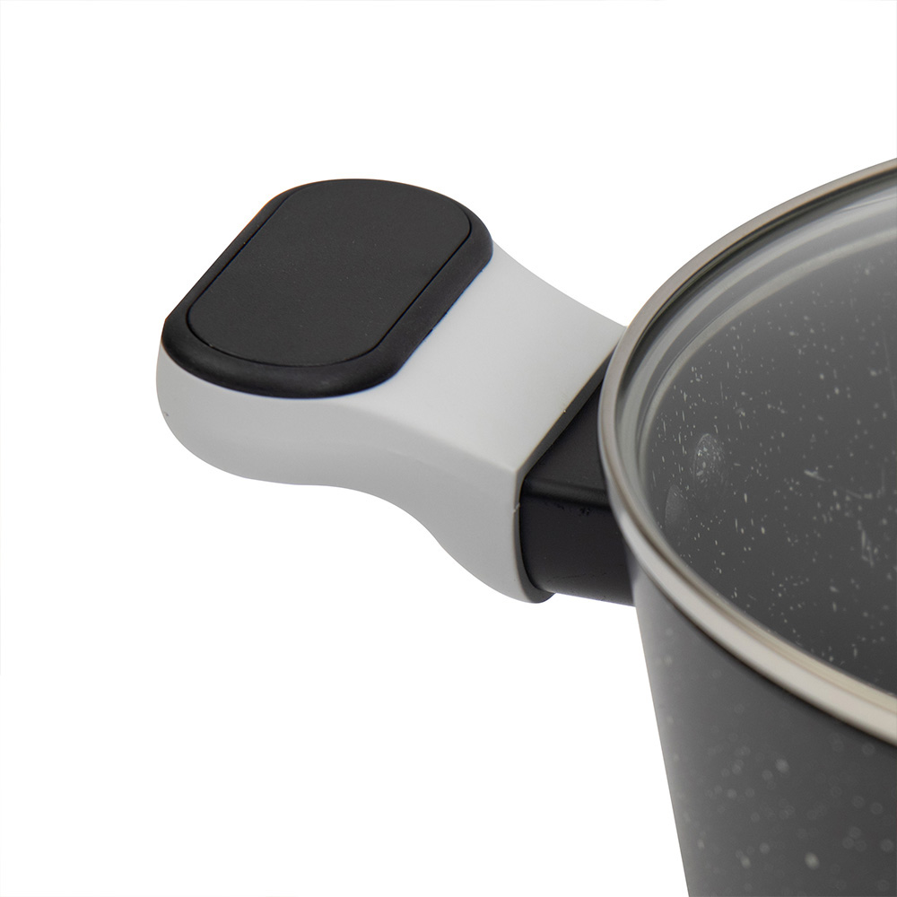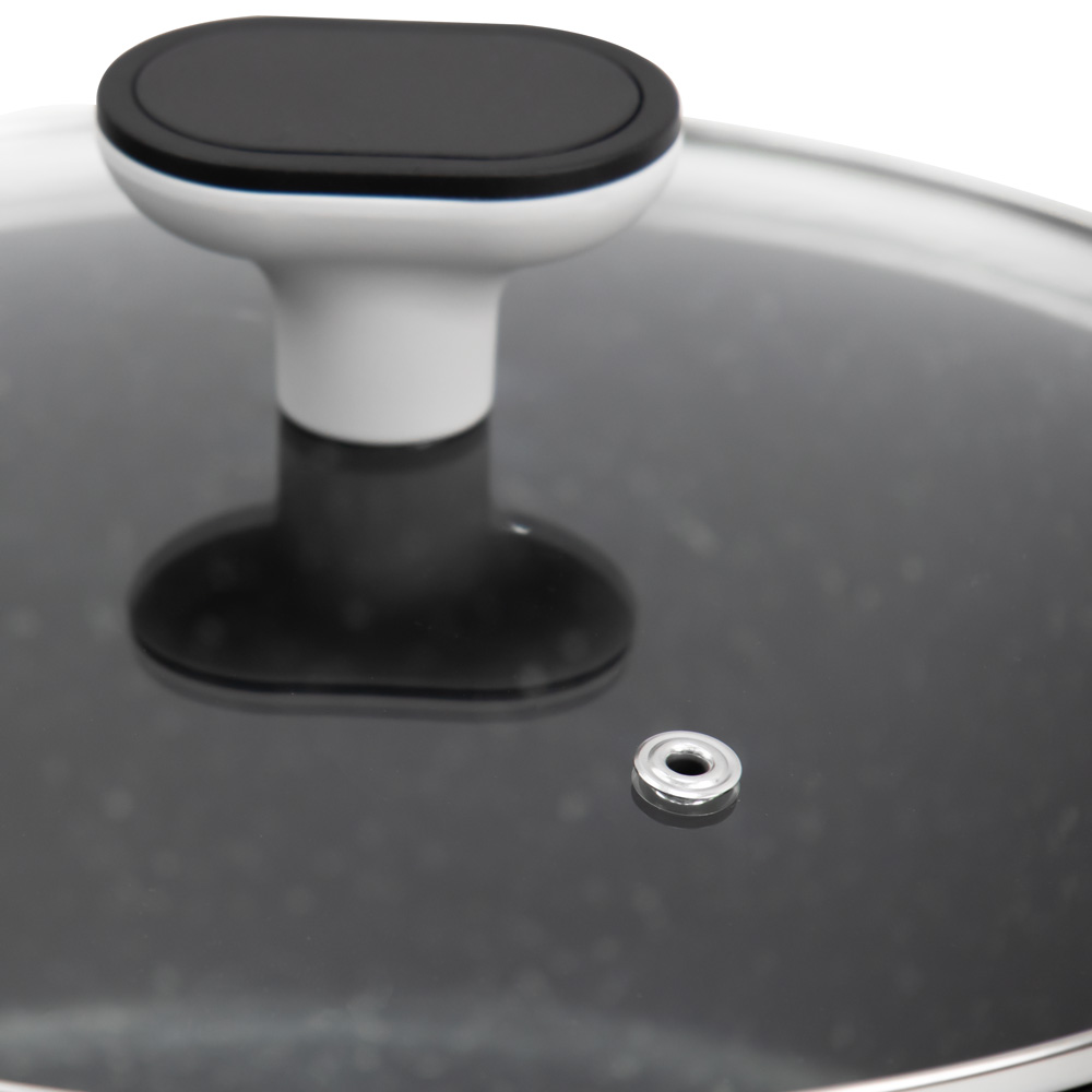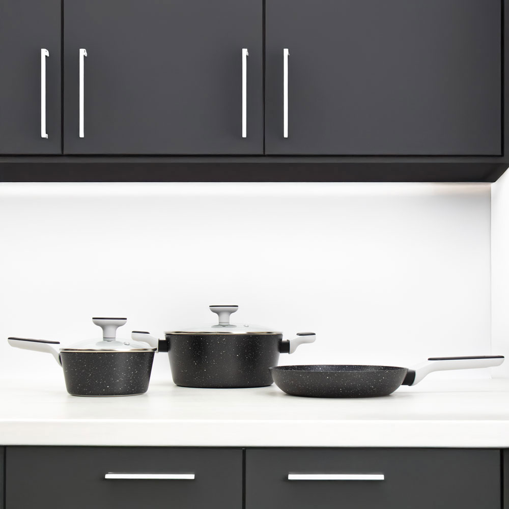 Each piece is made from aluminium with an induction-ready base to support even heat distribution across all standard hobs. The cookware features a marbled finish inside and out, with a non-stick coating on the interior that supports cooking with less oil and smooth food release. Stay-cool handles and lid knobs are shaped for a comfortable, secure grip. Tempered glass lids include steam vents for controlled cooking, while hanging loops on the long pan handles offer flexible storage options. The full set is dishwasher safe for straightforward everyday care.
