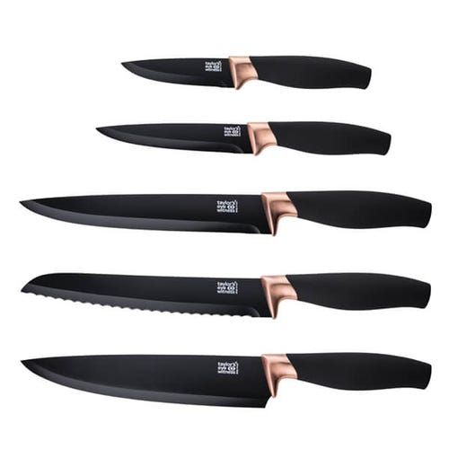 The Brooklyn Rose Gold 5 Piece Fan-Shaped Knife Block Set from Taylor’s Eye Witness includes five essential kitchen knives in a stylish clear fan-shaped knife block.